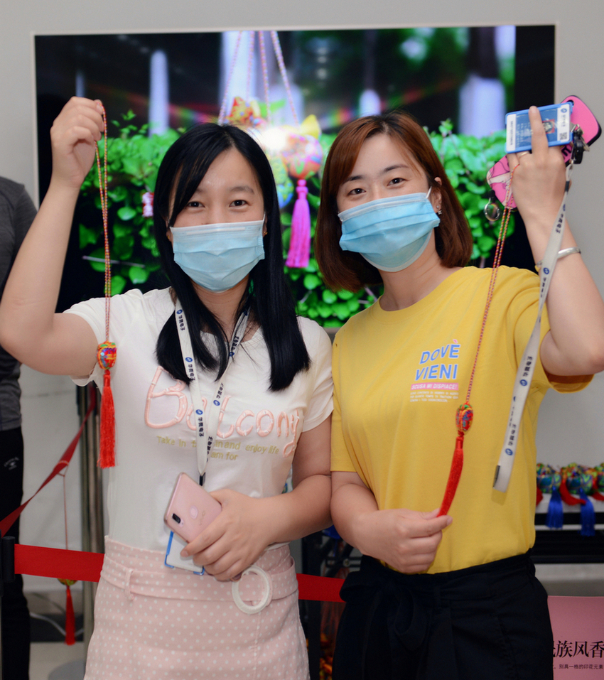 领到香包的员工在活动主题屏幕前合影留念