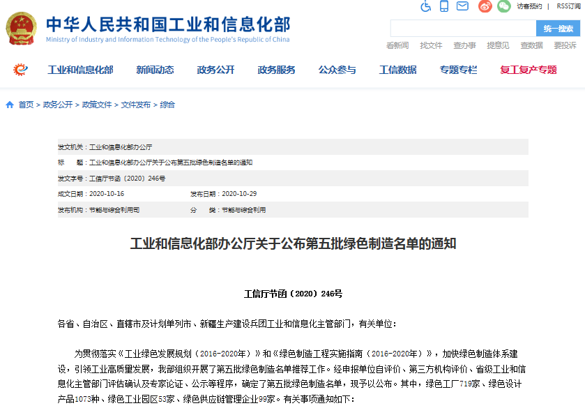 2020/11/6 | 来自:人力资源2020年10月29日,国家工业和信息化部公布了国家第五批绿色制造名单,太阳集团tyc4633成功获评“国家级绿色工厂”。