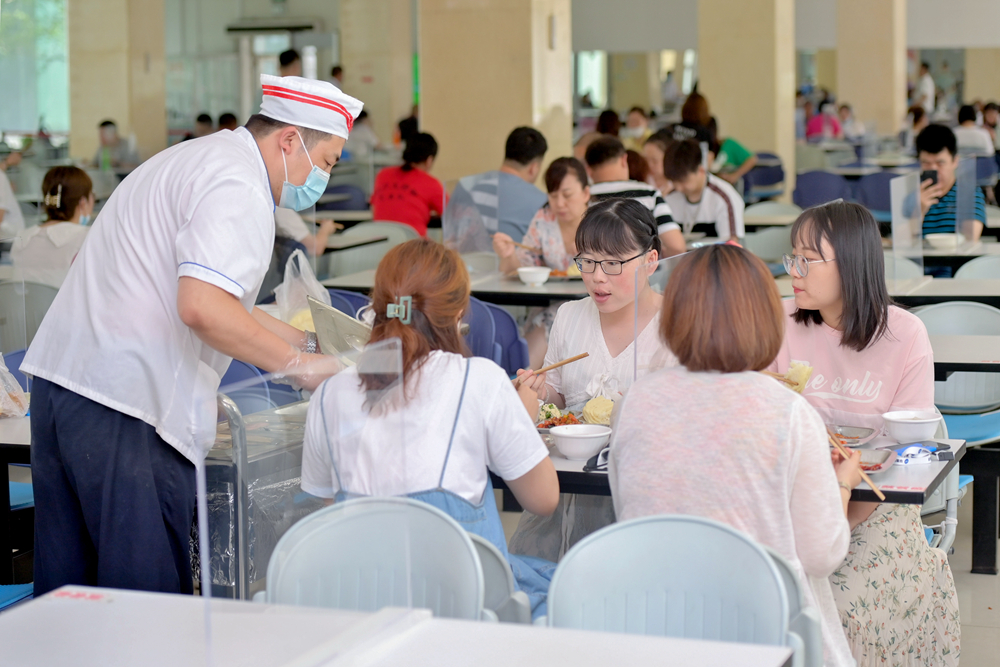 “有肉、有菜、有汤,很丰富,也安全健康。”7月1日,免费餐推行的第一天,一荤一素,菜品是溜肉段和尖椒炒干豆腐,搭配鸡蛋柿子汤,员工们说:“平时打这一套饭菜大概得七八块钱,现在都免费了,心里又暖又高兴,谢谢公司。”