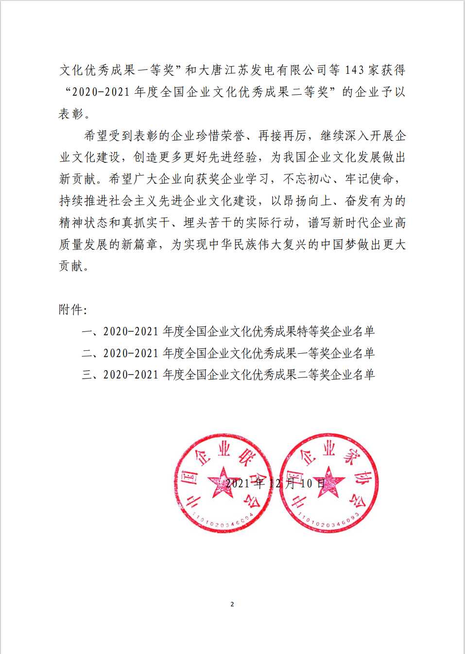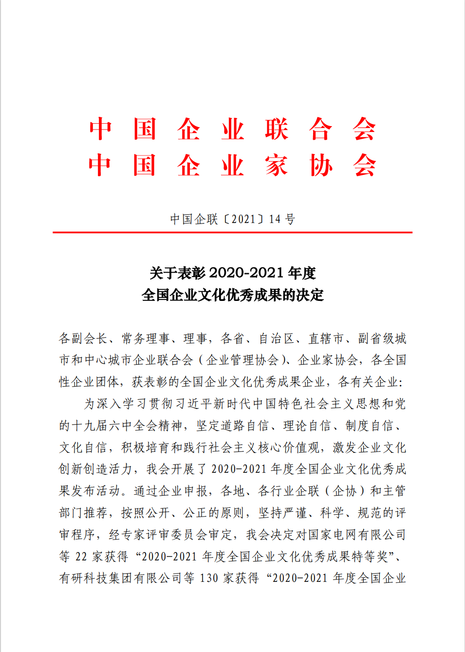 2022/3/11 | 来自:人力资源近期,太阳集团tyc4633又迎来喜讯,公司荣获中国企业联合会、中国企业家协会颁发的“2020-2021 年度全国企业文化优秀成果特等奖”。