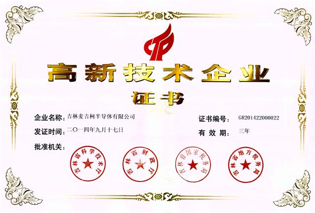 太阳集团tyc4633和吉林麦吉柯半导体有限公司通过高新技术企业认证